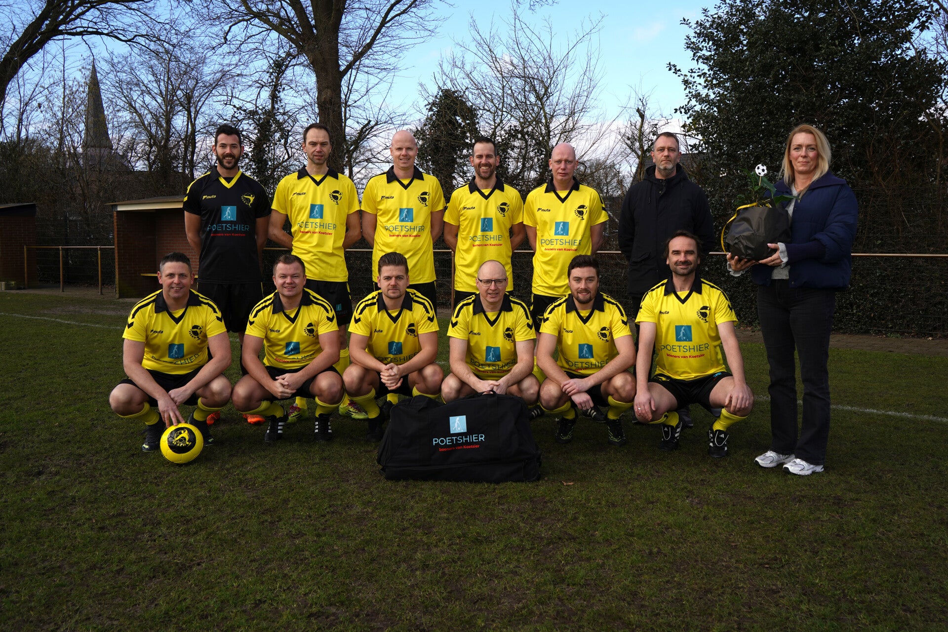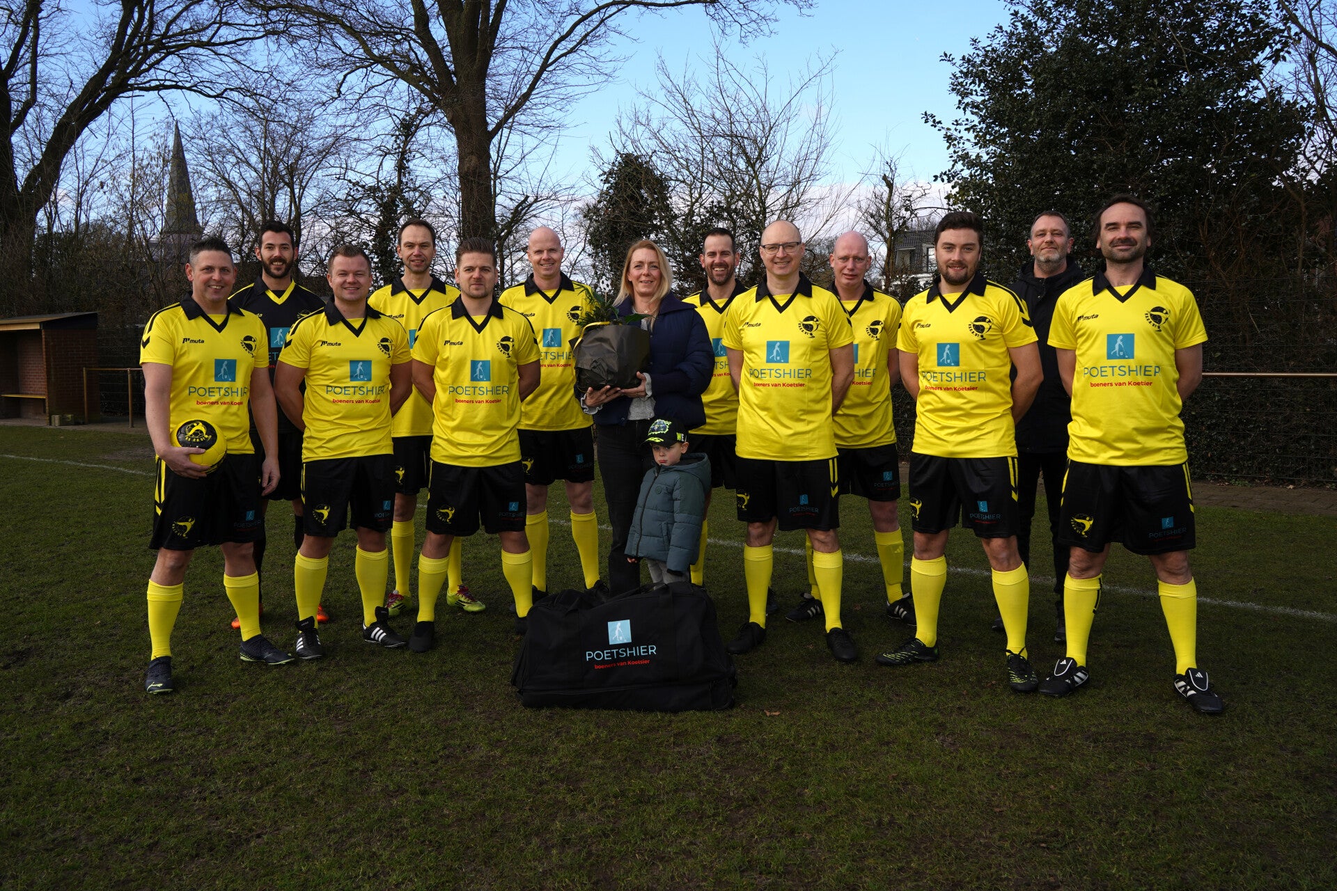 Onder een heerlijk winterse zon werden de VSCO’61 Mannen 35+1 afgelopen zaterdag in een nieuwe wedstrijdoutfit gestoken door Poetshier Schoonmaak uit Elspeet. Op sportpark De Heughte overhandigde Objectleidster Eva de Bruin namens Poetshier de wedstrijdtenues officieel aan de mannen van leider Bert Schreurs. Aanvoerder George Wastenecker bedankte Poetshier heel hartelijk en bood een fraai bloemstuk aan als blijk van grote waardering, waarna het team de sponsor honoreerde met een stevig applaus. Ook sponsorcommissielid Lammert Vlieger bedankte Poetshier voor het sportieve gebaar en wenste het schoonmaakbedrijf een nog grotere naamsbekendheid en veel zakelijk succes toe.