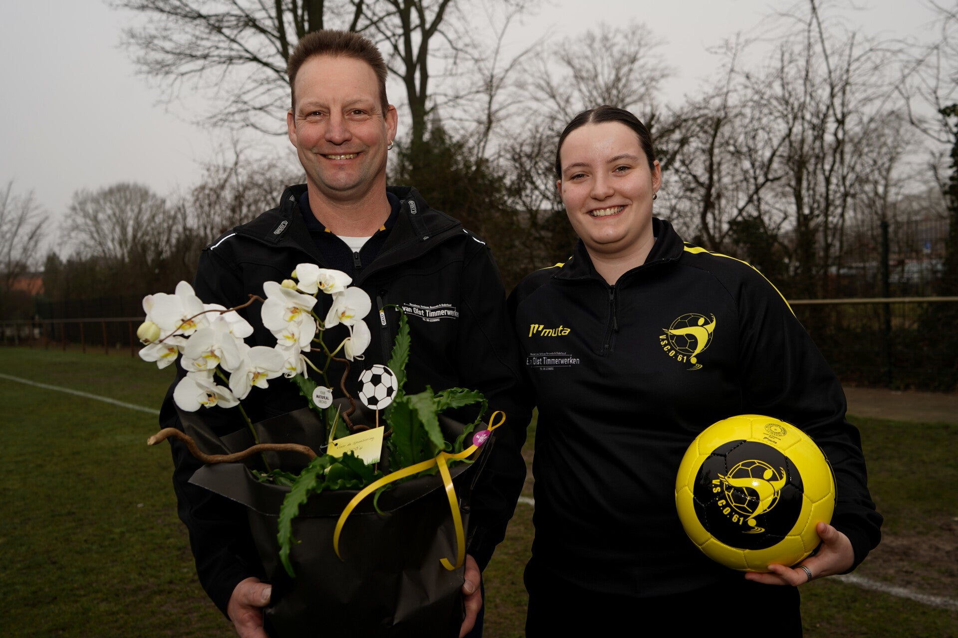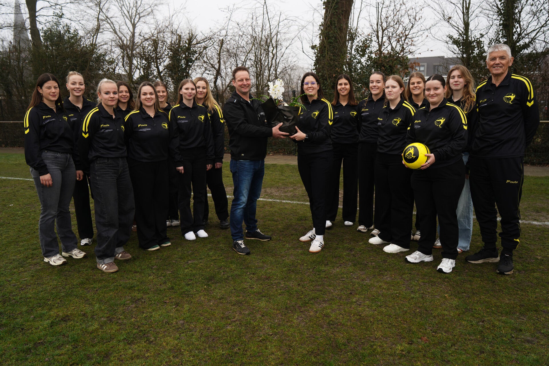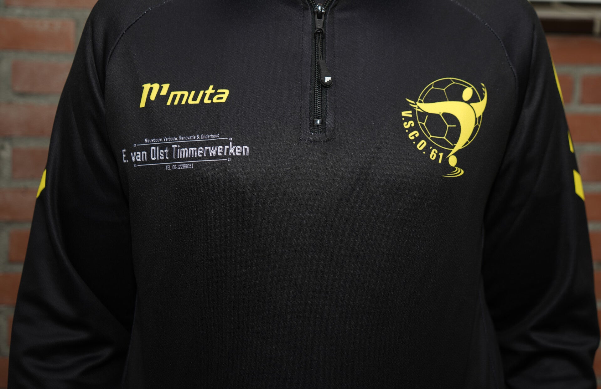 Afgelopen zaterdag 7 Maart 2026 is het vrouwen-1 team van VSCO’61 aangenaam verrast door sponsor E. van Olst Timmerwerken uit Elburg. Op sportpark De Heughte overhandigde eigenaar Erik van Olst officieel de prachtig en nieuw ontworpen Ziptop sweaters aan de dolenthousiaste vrouwen. Aanvoerster Demi van der Velde en sponsorcommissielid Lammert Vlieger bedankten de kledingsponsor heel hartelijk en overhandigden een fraai bloemstuk als blijk van grote waardering. Het vrouwen-1 team bood vervolgens Erik een leuk Belgisch Bieren Pakket aan als grote dank voor vervulling van hun gekoesterde wens.